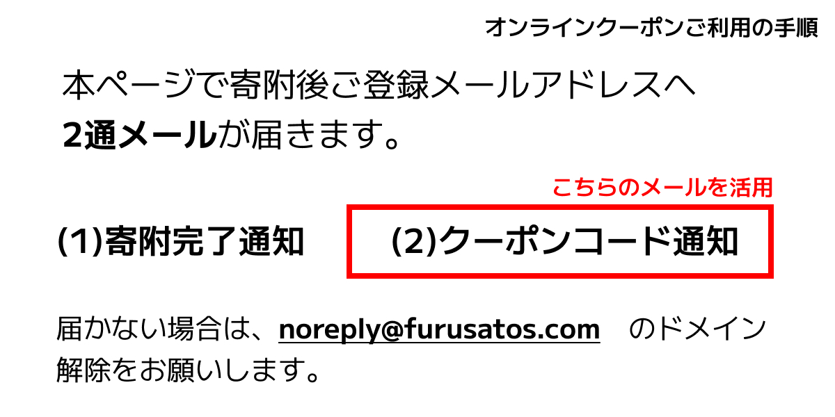 2. 寄附完了後、「ふるさとズ」から注文完了メールおよびクーポンコードを記載したメールが届きます。