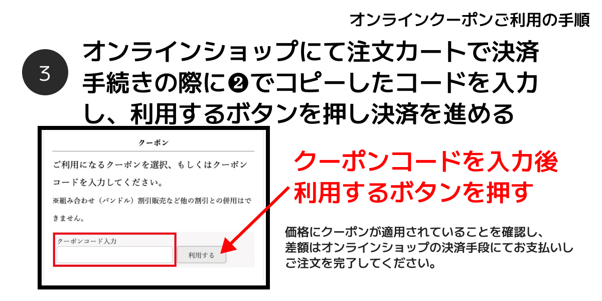 ※取得したクーポンコードは、対象のオンラインショップ以外ではご利用できません。